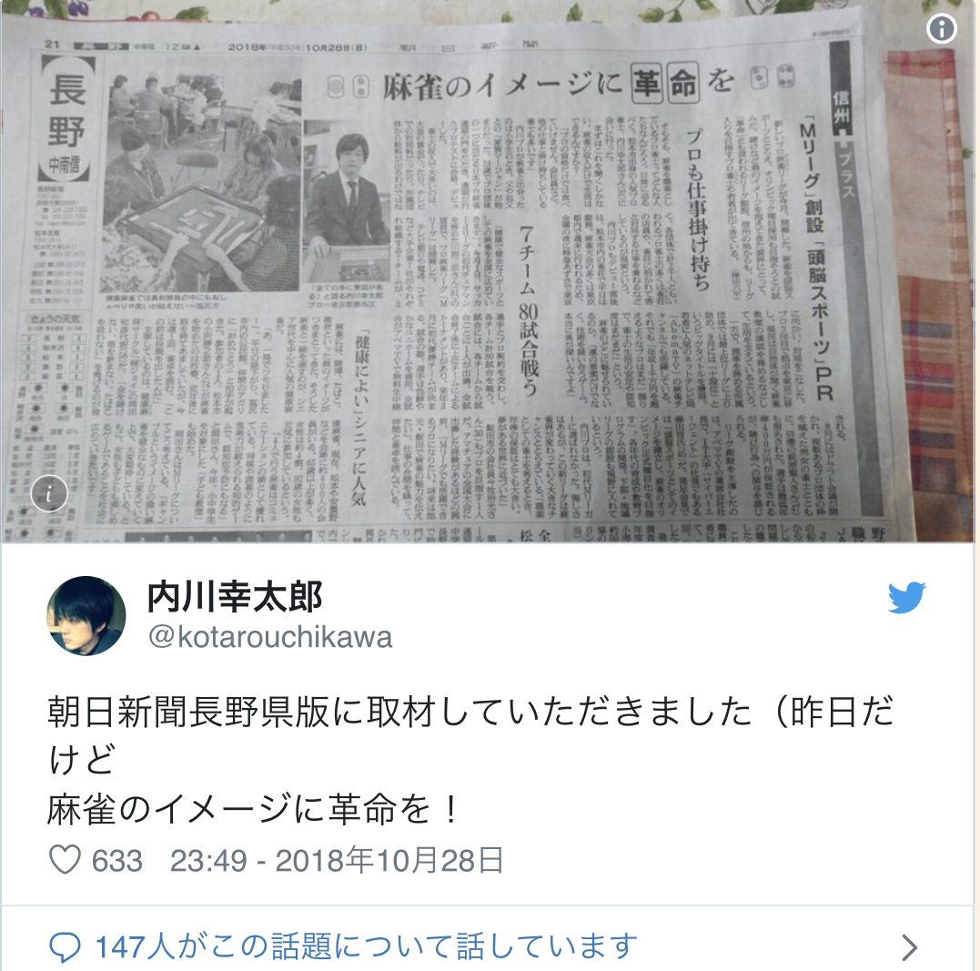 Mahjong Article in Asahi Shinbun Nagano Prefecture Edition